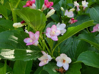 白からピンクへグラデーションで花を咲かせるハコネウツギ。