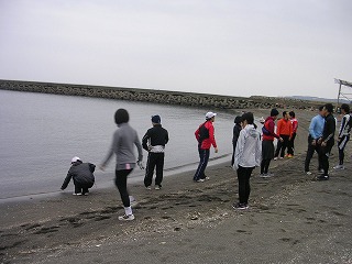 準備体操を終えた後、アジア選手権当日の水温を感じ取ってもらう為、ホテル前の浜辺へ行き、