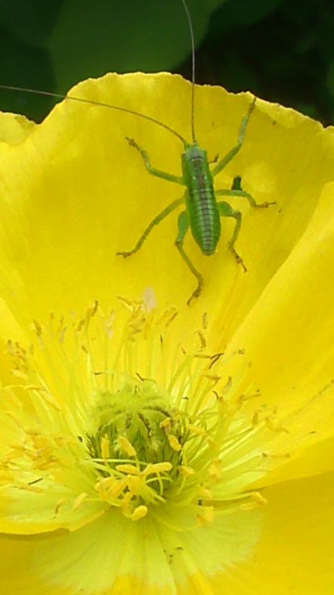 黄色のポピーと緑の昆虫(名前がわかりませんが…)