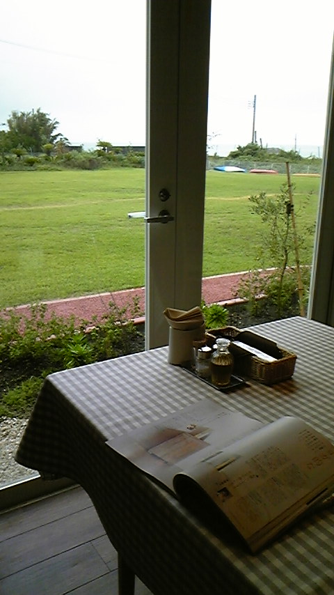 窓際の席からは雨でキラキラ光る芝生の庭、そして海が見渡せます。